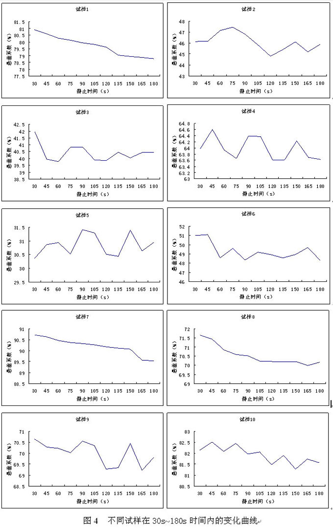 圖4表明:懸垂圖像在一定的時(shí)間范圍內(nèi)是變化的,呈振蕩形,特別是試樣2、3、4、5、6、9、10振蕩非常明顯,而對(duì)于不同的試樣在變化時(shí)的振幅是有差異的。