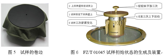FZ/T 0 1045-1996標(biāo)準(zhǔn)中規(guī)定試樣放好后要將試樣托放在夾持盤(pán)上,加上蓋,輕輕向下按三次。“輕輕向下按三次”使試樣隨機(jī)放到夾持盤(pán)上后有三次機(jī)械性的規(guī)律舒展變化,改變了試樣人為擺放下落的“隨機(jī)性”,消除了使用操作者不同手法的差異。這是趙文賢先生發(fā)現(xiàn)試樣直接放在夾持盤(pán)上受“隨機(jī)性”和手法差異的影響而導(dǎo)致試驗(yàn)重現(xiàn)性較差,因此發(fā)明了中國(guó)最早的懸垂試驗(yàn)試樣初始狀態(tài)生成裝置,首次應(yīng)用在1984年的FJ539織物懸垂性試驗(yàn)方法的中國(guó)標(biāo)準(zhǔn)當(dāng)中(見(jiàn)圖6,標(biāo)注中的數(shù)字為先后順序)。