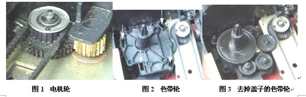 經(jīng)驗告訴我們:在紡織廠上述故障概率頗高。實際上排除這些故障并非需要專職技術(shù)人員,只要我們細心一點便可解決。因為每個尼龍齒輪全部或局部裸露,微小的飛花落到上面,齒輪運轉(zhuǎn)會將其一一壓附在齒輪溝槽中,當超過一定限量時傳動機構(gòu)就不流暢了,或死機,或終止打印、或不走紙……不一而足。如果不仔細觀察或經(jīng)驗不足,還真不容易發(fā)現(xiàn),壓附在齒輪溝槽中的飛花由于長時間的碾壓已經(jīng)和齒輪顏色差不多了。處理時,用細竹簽或者尖鑷子將飛花逐齒清理剔除,注意別傷了齒輪,這些齒輪包括電機主動輪、被動輪、色帶傳動輪、色帶循環(huán)輪、膠輥傳動輪等。見圖1電機輪、圖2色帶輪 、圖3去掉蓋子的色帶輪,箭頭指示方向,深入小型平頭起子打開色帶輪蓋子,就會露出色帶循環(huán)輪。這些齒輪都容易黏附飛花。希望圖示對您有幫助。