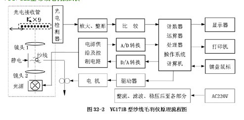 連續(xù)運動的紗線通過檢測區(qū)時,光源將紗線一側的毛羽投影成像,凡是大于設定長度的毛羽就會遮擋光束,光電檢測器把毛羽擋光引起的變化轉換成相應的電信號,然后進行信號處理、統(tǒng)計。測試毛羽時可以同時施加靜電檢測毛羽會試依附在紗線主體上毛羽顯現(xiàn)出來,也會使纖維圈拉直。(流程圖見圖32-2)。