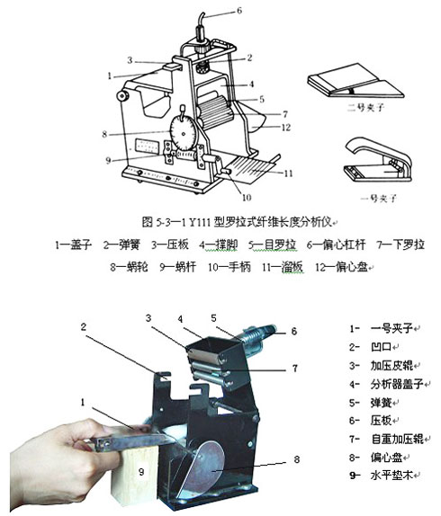 1、儀器的結(jié)構(gòu) (Y111型羅拉式纖維長度分析儀)Y111型羅拉式纖維長度分析儀結(jié)構(gòu)如圖5-3所示。儀器的上半部是一個可以揭起的蓋子,蓋子上有彈簧和壓板。撐角上裝有上羅拉。當(dāng)壓板嵌入支架的缺口并轉(zhuǎn)動偏心杠桿時,彈簧便以7000g的壓力壓住上羅拉。