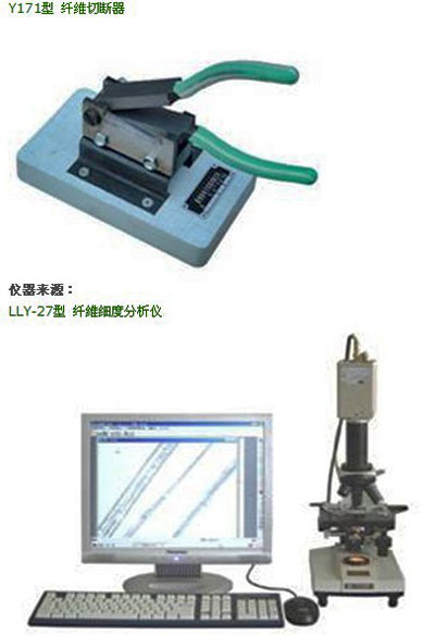 試驗(yàn)儀器為(Y171型 纖維切斷器 )Y171型纖維切斷器(10 mm)、顯微鏡或投影儀(放大150-200)和扭力天平(稱量25mg及10mg各一架)。試樣為棉纖維一種。并需有限制器絨板、梳針(稀針10針/cm,密針20針/cm)、一號(hào)夾子、壓板、鑷子、小鋼尺和載玻片等。