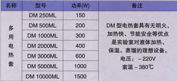 電熱套分DM多用型、KDM調(diào)溫型、ZDM數(shù)顯恒溫性、CKDM磁力加熱攪拌型。廣泛應(yīng)用于醫(yī)療衛(wèi)生、大專院校、石油、化工、電子儀表、物理、化學(xué)、生物工程、輕工食品等研究部門、企業(yè)做物理測(cè)試及化學(xué)分析的液體加熱、保溫蒸餾等。