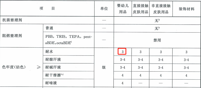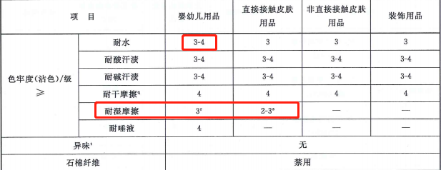 增加了嬰幼兒用品和直接接觸皮膚用品耐濕摩擦色牢度的要求,將嬰幼兒用產品的耐水色牢度提高到3-4級;