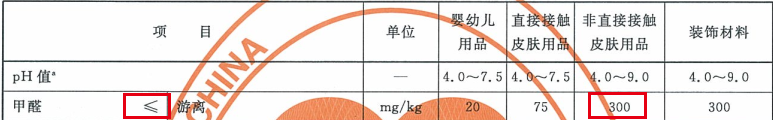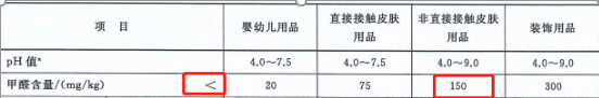 修改了限量要求,將“≤”修改為“<”;將非直接接觸皮膚用品的甲醛含量限值由“300mg/kg”修改為“150mg/kg”。