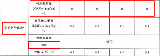 修改了“苯酚化合物”名稱的表述為“含氯苯酚”,刪除鄰苯基苯酚,同時新增三氯苯酚總量、二氯苯酚總量、一氯苯酚總量。新增“其他化學殘余”(鄰苯基苯酚、富馬酸二甲酯、致癌芳香胺、苯胺、雙酚A),并將嬰幼兒用產品和其他產品中鄰苯基苯酚限量值分別由“50 mg/kg”、“100 mg/kg”修改為“10 mg/kg”、“25 mg/kg”;